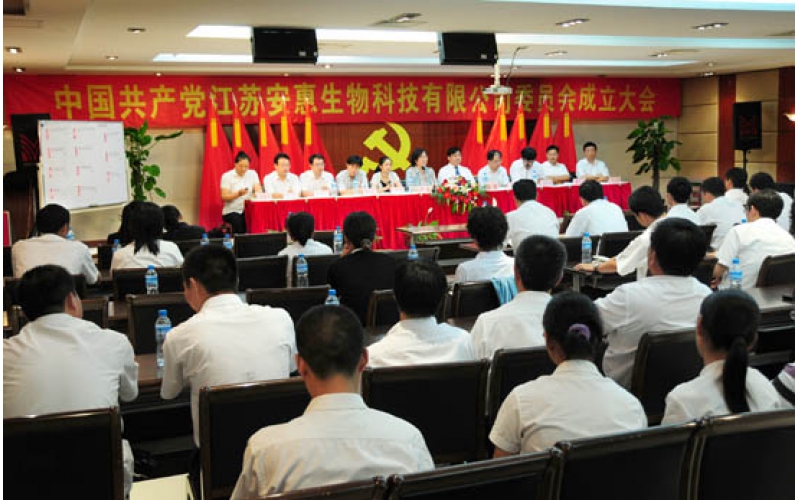 2009年6月30日,中國(guó)共產(chǎn)黨江蘇安惠生物科技有限公司委員會(huì)成立。開(kāi)發(fā)區(qū)黨工委副書(shū)記、管委會(huì)副主任嚴(yán)憲,“兩新”工委書(shū)記、組織部副部長(zhǎng)邵平,紀(jì)工委副書(shū)記王艷青等出席成立大會(huì)。