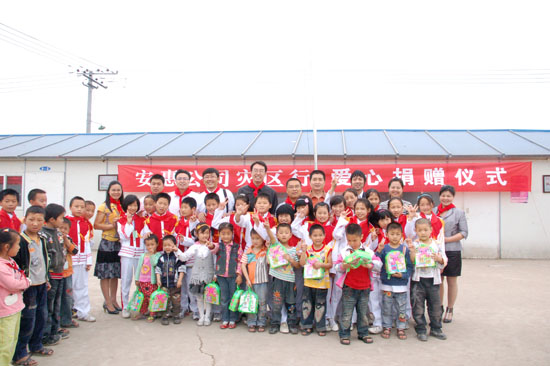 2009年5月12-13日,安惠公司舉行大地震周年系列紀念活動。副總經理柯建民再赴德陽,給綿竹拱星小學孩子們送去“愛心包裹”。