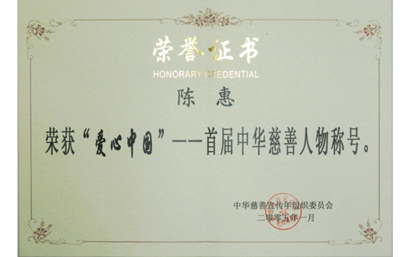 2005年1月31日,中華慈善總會在北京民族飯店召開新聞發(fā)布會,陳惠董事長當(dāng)選“愛心中國”——首屆中華慈善人物。